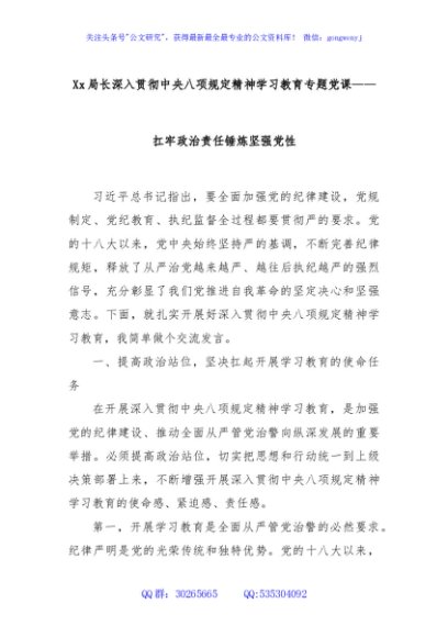 / Xx局长深入贯彻中央八项规定精神学习教育专题党课——扛牢政治责任锤炼坚强党性