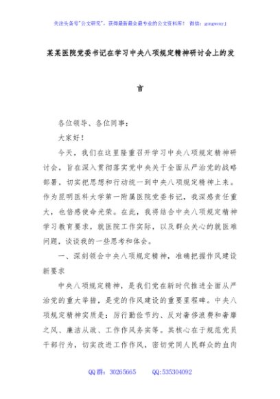 / 某某医院党委书记在学习中央八项规定精神研讨会上的发言