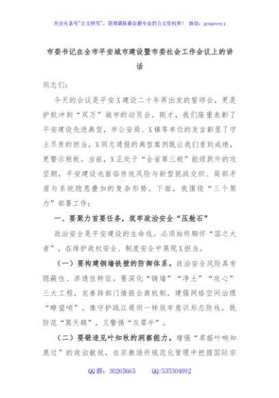 / 市委书记在全市平安城市建设暨市委社会工作会议上的讲话