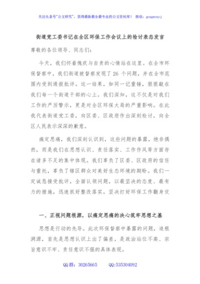 / 街道党工委书记在全区环保工作会议上的检讨表态发言