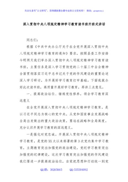 / 深入贯彻中央八项规定精神学习教育读书班开班式讲话