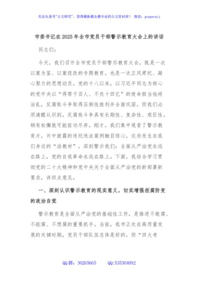/ 市委书记在2025年全市党员干部警示教育大会上的讲话