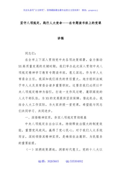 / 坚守八项规定,践行人大使命——在专题读书班上的党课讲稿
