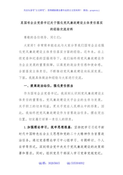 / 某国有企业党委书记关于强化党风廉政建设主体责任落实的经验交流材料