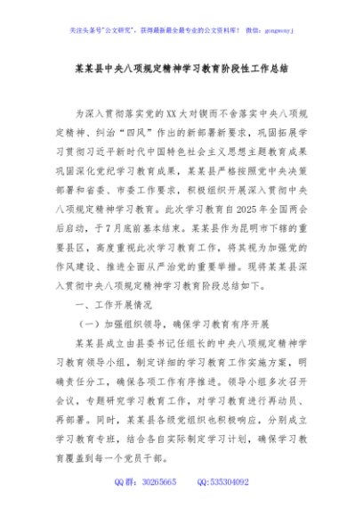 某某县中央八项规定精神学习教育阶段性工作总结