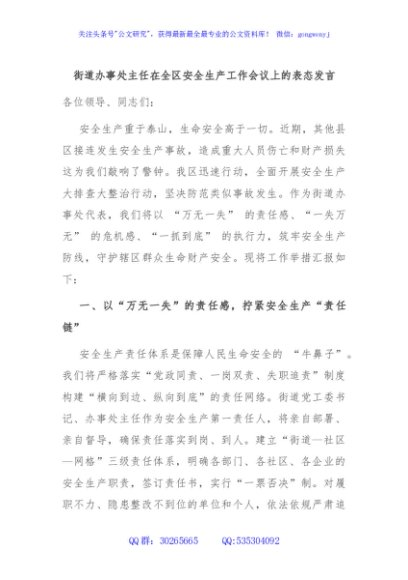 / 街道办事处主任在全区安全生产工作会议上的表态发言