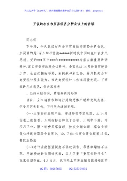 / 王俊岭在全市贸易经济分析会议上的讲话