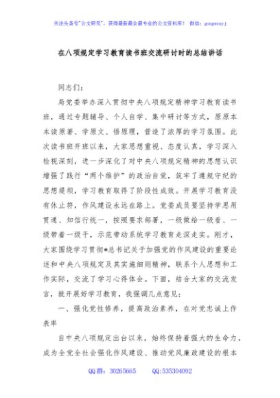 / 在八项规定学习教育读书班交流研讨时的总结讲话