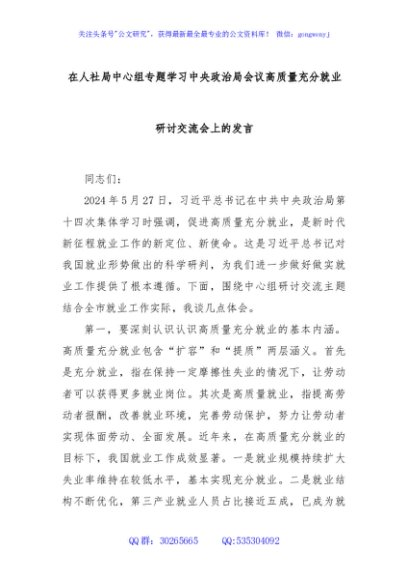 / 在人社局中心组专题学习中央政治局会议高质量充分就业研讨交流会上的发言