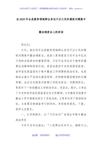 / 在2025年全县教育领域群众身边不正之风和腐败问题集中整治调度会上的讲话