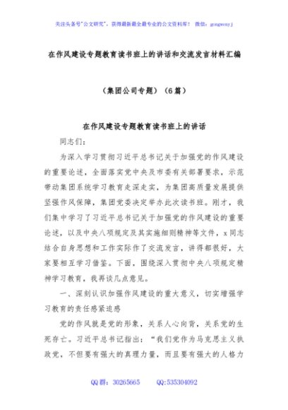 (6篇)在作风建设专题教育读书班上的讲话和交流发言材料汇编(集团公司专题)