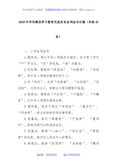 / 2025年作风建设学习教育交流发言金词金句汇编(四组45条)