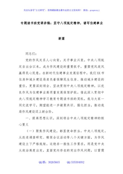 / 专题读书班党课讲稿:坚守八项规定精神,谱写住建事业新篇