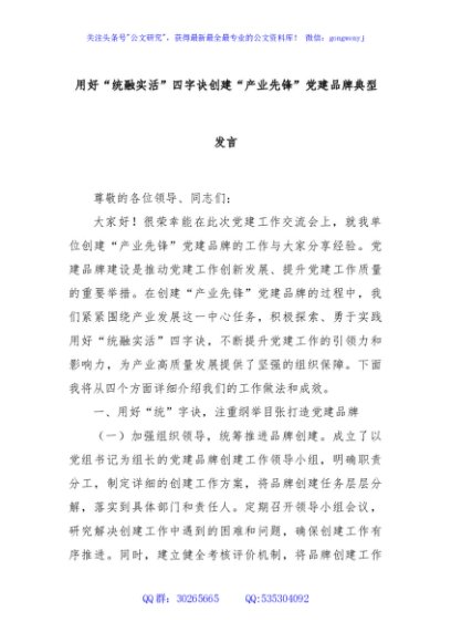 用好“统融实活”四字诀创建“产业先锋”党建品牌典型发言