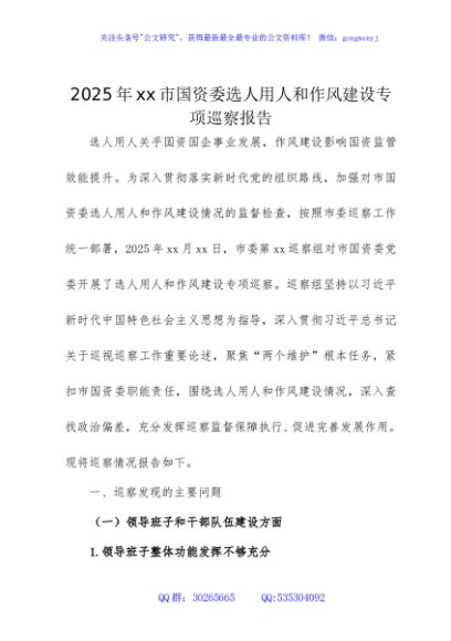 / 2025年xx市国资委选人用人和作风建设专项巡察报告