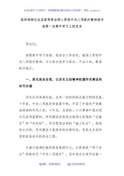 / 组织部部长在县委常委会深入贯彻中央八项规定精神读书班第一次集中学习上的发言