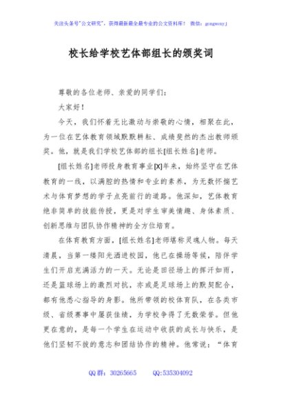 / 校长给学校艺体部组长的颁奖词