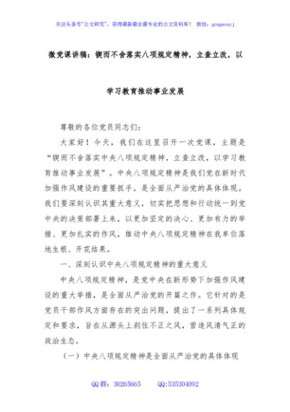 / 微党课讲稿:锲而不舍落实八项规定精神,立查立改,以学习教育推动事业发展