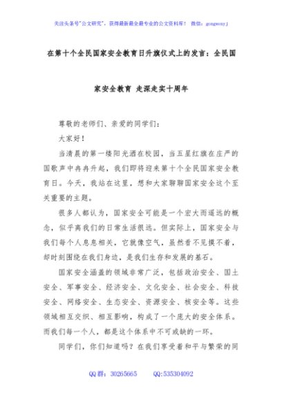 / 在第十个全民国家安全教育日升旗仪式上的发言:全民国家安全教育 走深走实十周年