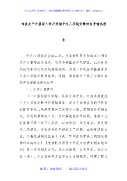 / 市委关于开展深入学习贯彻中央八项规定精神自查情况报告