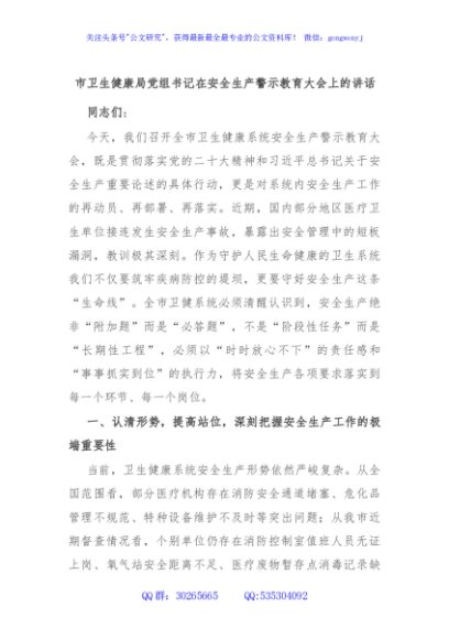 / 市卫生健康局党组书记在安全生产警示教育大会上的讲话