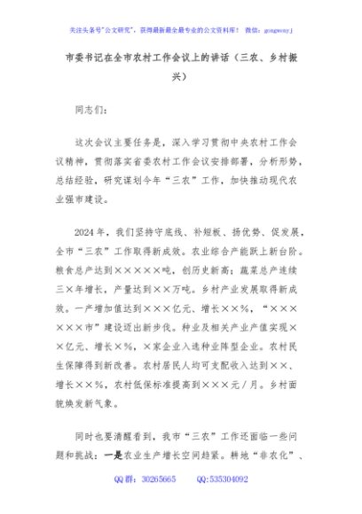 / 市委书记在全市农村工作会议上的讲话(三农、乡村振兴)