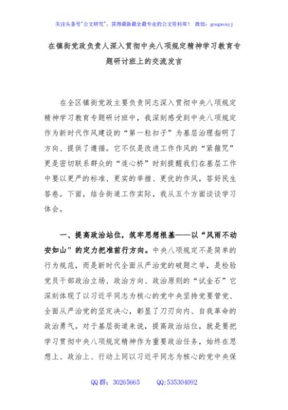 / 在镇街党政负责人深入贯彻中央八项规定精神学习教育专题研讨班上的交流发言