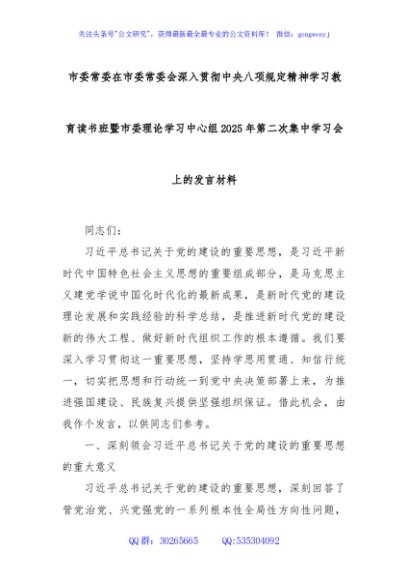 / 市委常委在市委常委会深入贯彻中央八项规定精神学习教育读书班暨市委理论学习中心组2025年学习会发言1