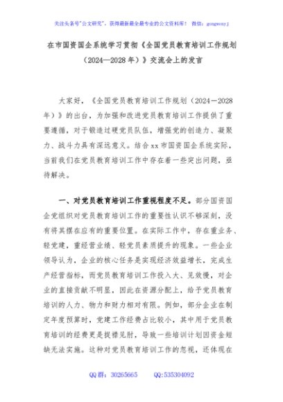 / 在市国资国企系统学习贯彻《全国党员教育培训工作规划(2024—2028年)》交流会上的发言