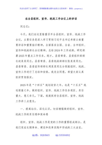 / 在全县组织、宣传、统战工作会议上的讲话