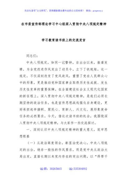 / 在市委宣传部理论学习中心组深入贯彻中央八项规定精神学习教育读书班上的交流发言