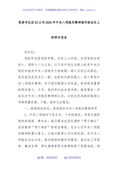 / 党委书记在XX公司2025年中央八项规定精神读书班会议上的研讨发言
