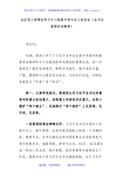 / 在区党工委理论学习中心组集中研讨会上的发言(总书记重要讲话精神)