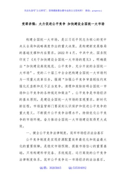 / 党课讲稿:大力促进公平竞争 加快建设全国统一大市场