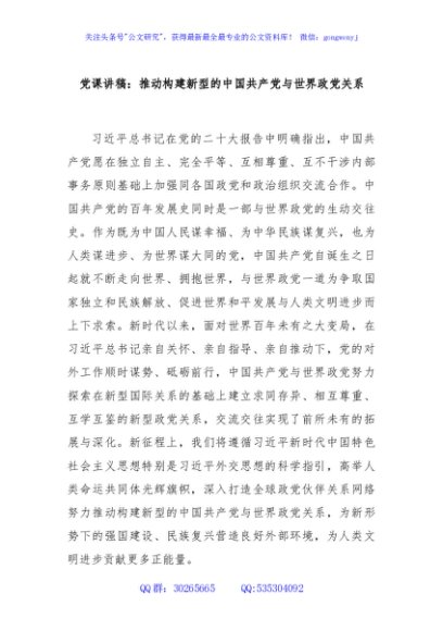 / 党课讲稿:推动构建新型的中国共产党与世界政党关系
