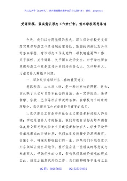 / 党课讲稿:落实意识形态工作责任制,筑牢学校思想阵地