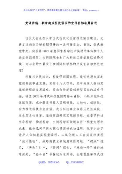 / 党课讲稿:朝着建成科技强国的宏伟目标奋勇前进