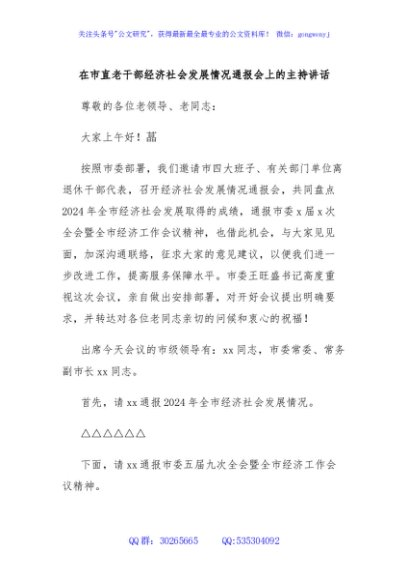 / 在市直老干部经济社会发展情况通报会上的主持讲话