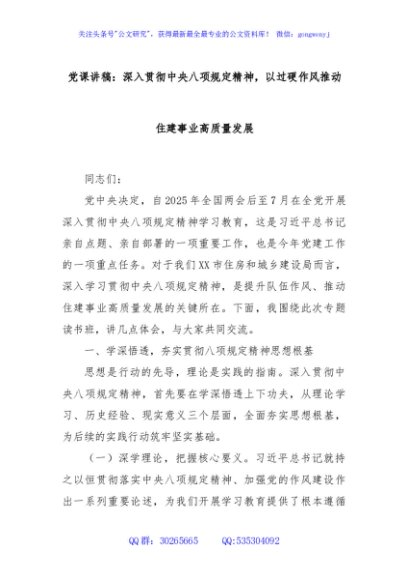 / 党课讲稿:深入贯彻中央八项规定精神,以过硬作风推动住建事业高质量发展