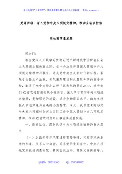 / 党课讲稿:深入贯彻中央八项规定精神,推动全省农村信用社高质量发展