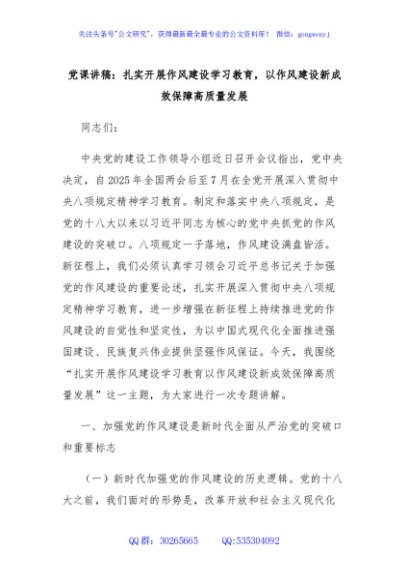 / 党课讲稿:扎实开展作风建设学习教育,以作风建设新成效保障高质量发展