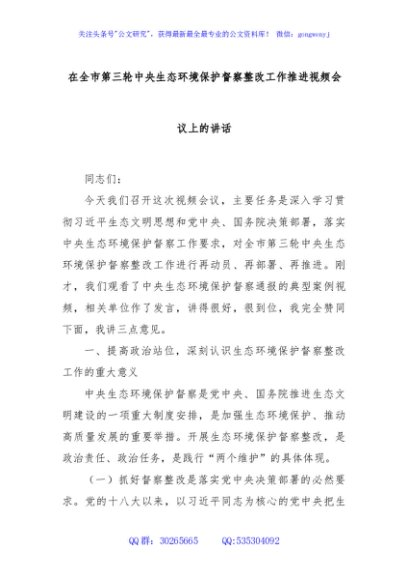 / 在全市第三轮中央生态环境保护督察整改工作推进视频会议上的讲话