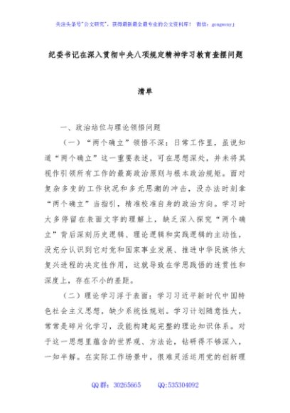 / 纪委书记在深入贯彻中央八项规定精神学习教育查摆问题清单