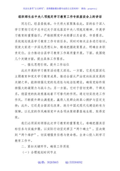 / 组织部长在中央八项规定学习教育工作专班座谈会上的讲话