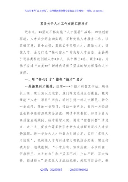 / 某县关于人才工作交流汇报发言