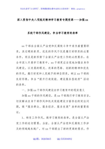 / 深入贯彻中央八项规定精神学习教育专题党课——加强xx系统干部作风建设,争当学习教育的表率
