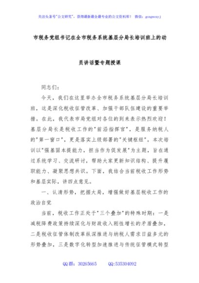 / 市税务党组书记在全市税务系统基层分局长培训班上的动员讲话暨专题授课