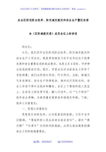 / 在全区防汛防台抗旱、防灾减灾救灾和安全生产暨区安委会(区防减救灾委)成员会议上的讲话