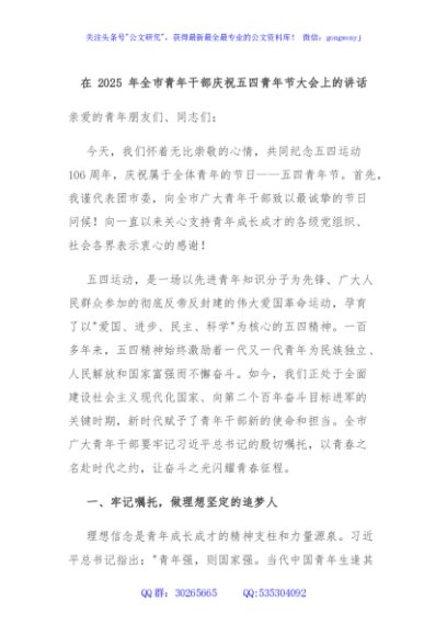 / 在 2025 年全市青年干部庆祝五四青年节大会上的讲话