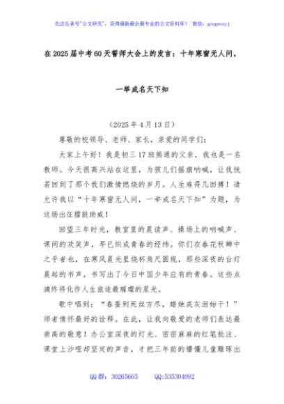 / 在2025届中考60天誓师大会上的发言:十年寒窗无人问,一举成名天下知